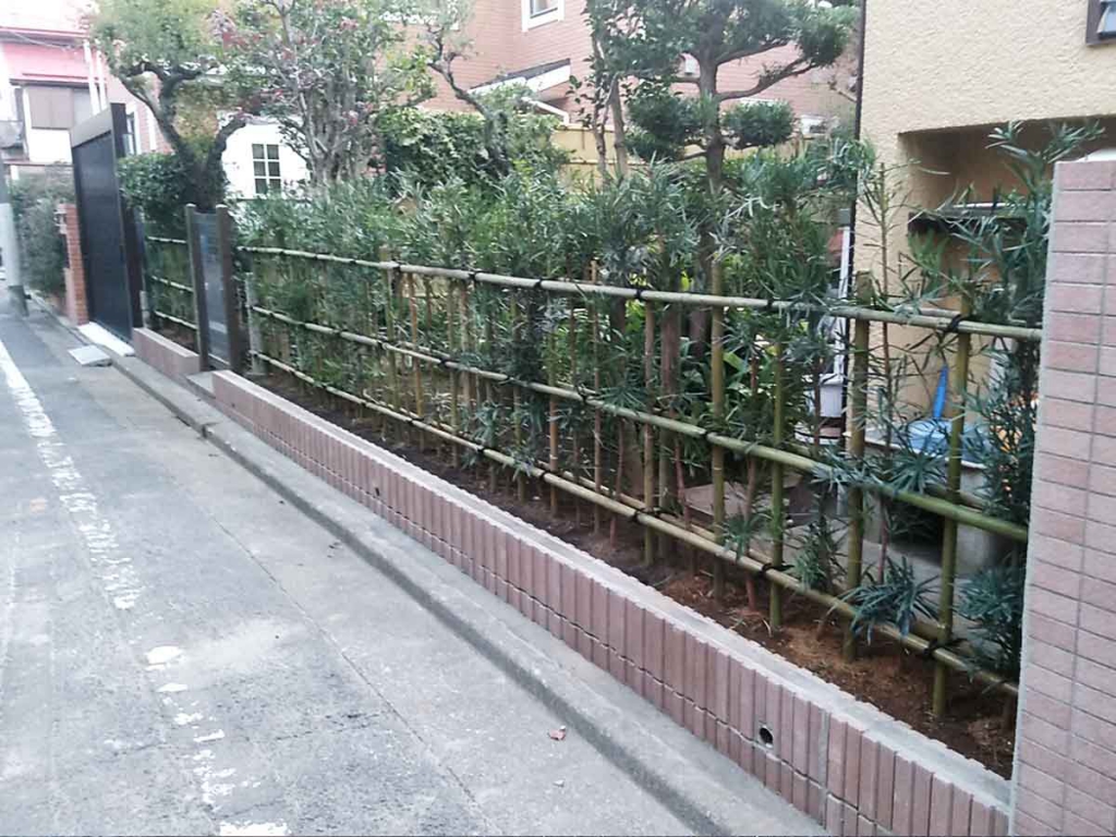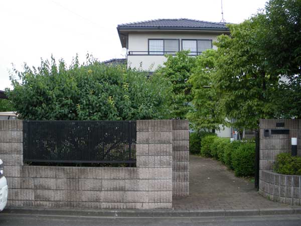 内容:不要既存樹木の伐採、抜根・既存ブロック塀の撤去処理・ブロック積み(二段)・生垣の植栽