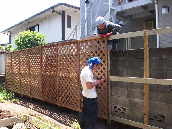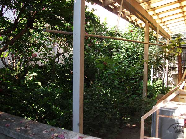 内容:除草、低木撤去、整地、植栽、ラティスフェンス設置、家庭菜園(新品の枕木設置)