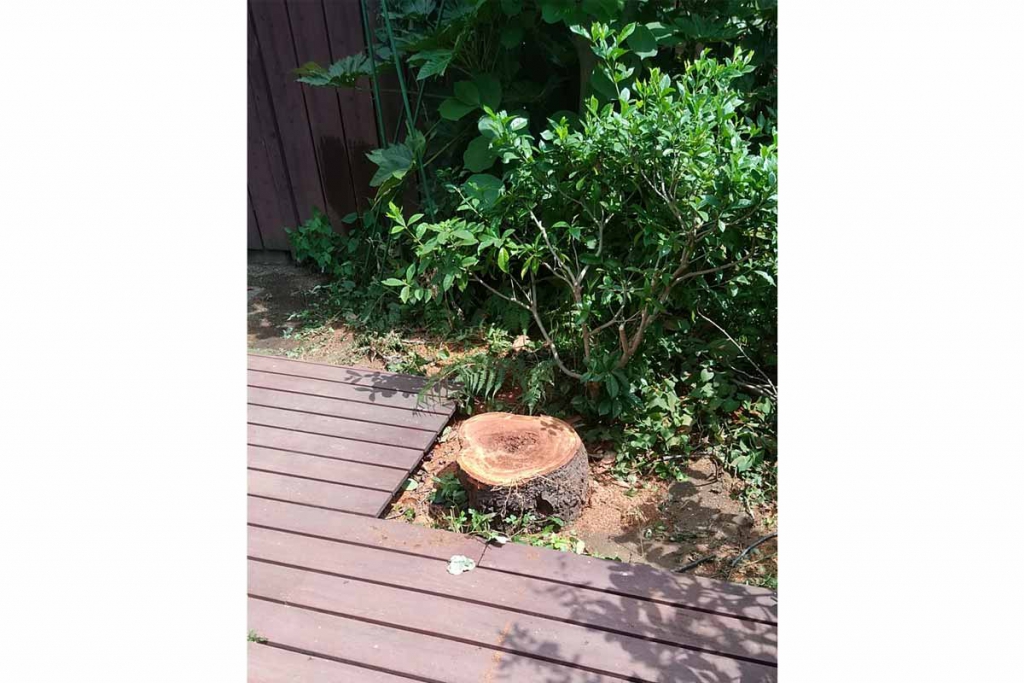 内容:既存樹伐採・伐根・下地整地・ピンコロ石縁石設置・ウッドデッキ・ウッドフェンス施工・人工芝張り