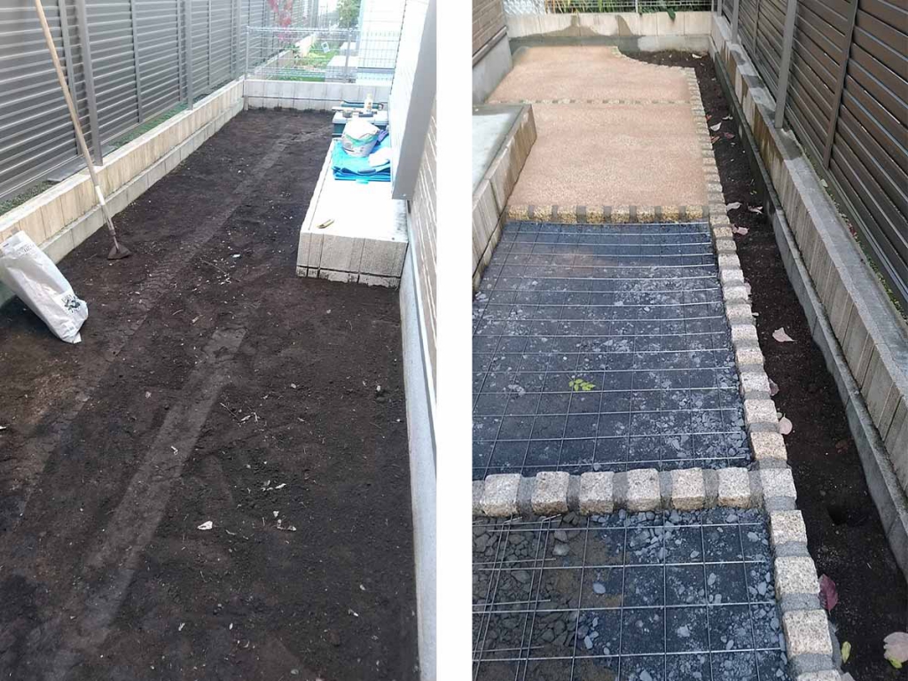 内容:除草・平板処分・下地整地・花壇ブロック並べ直し・ピンコロ石縁石・真砂土舗装