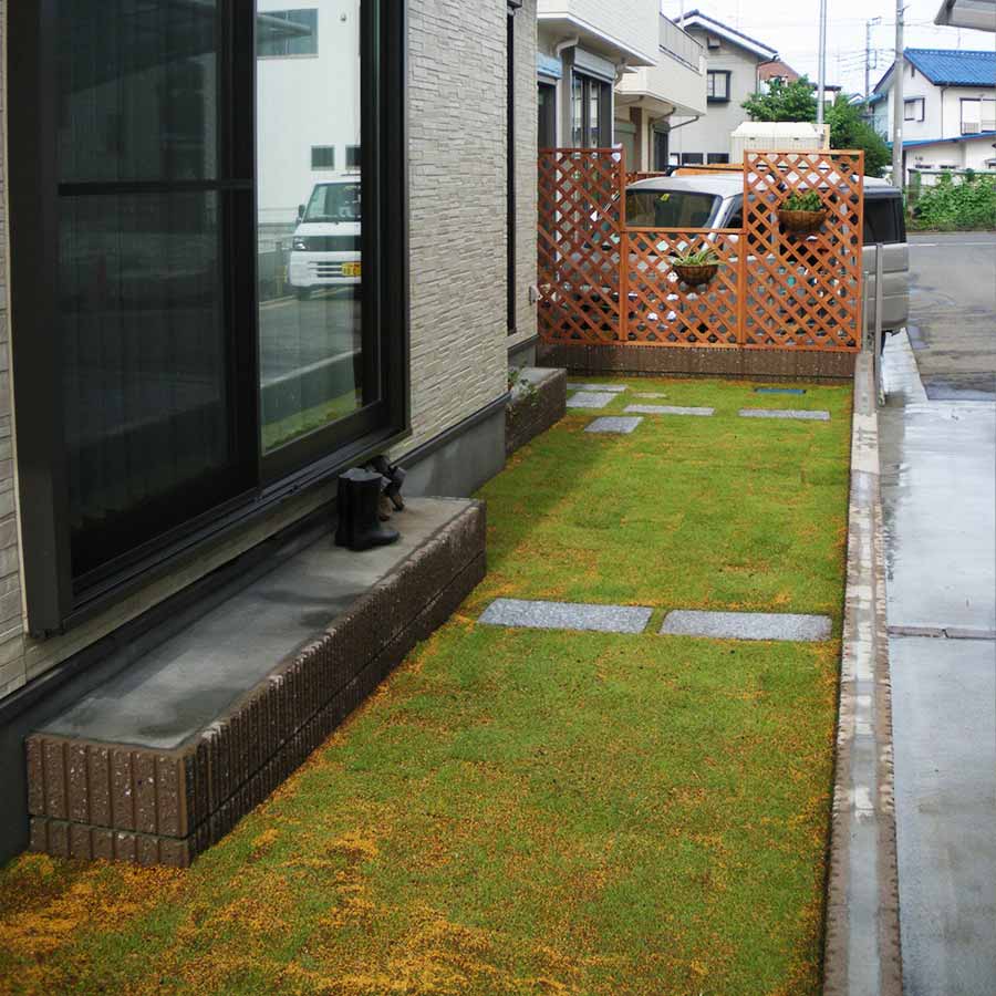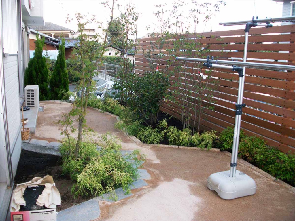 内容:新築戸建ての除草・整地・乱形石張り・人工芝・人工芝下の真砂土舗装・駐車場の拡張・ウッドフェンス設置・植栽等